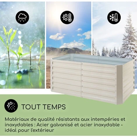 PROTECTION CONTRE LES INTEMPÉRIES : Le bac surélevé est solidement protégé contre toutes les formes d’intempéries grâce à un cadre en alliage zinc-aluminium spécialement conçu, un solide revêtement pour protéger le bac en toute saison.