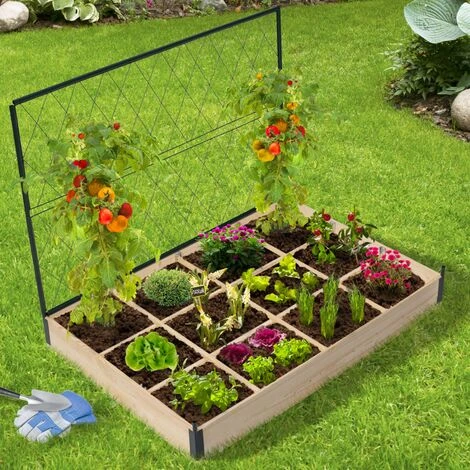 Cultivez à portée de main et facilement vos tomates, haricots et autres légumes grâce à ce carré potager en bois ultra pratique. Avec ses 12 compartiments, organisez vos plantations et prenez soin de chaque plant individuellement. Ce carré potager de 115 x 80 x 13,5 cm en bois est équipé d’un treillis en métal adaptable sur les 4 côtés du potager. Positionnez le treillis selon l’organisation que vous avez choisit et les besoins de vos cultures. La surface de plantation est délimitée pour organiser votre espace extérieur en toute simplicité. Définissez votre jardin selon vos envies grâce à votre potager en bois. À l’aide du treillis de 115 cm de hauteur, vos plants de tomates pourront s’épanouir en venant s’entrelacer dans le maillage en métal. Le treillis permet à vos plantations un meilleur développement et par conséquent une récolte optimale. Lancez-vous dans la culture grâce au carré potager en bois et son treillis, combinaison parfaite pour mixer les aromates, salades et plantes grimpantes dans un même potager. Conseil IDMarket : appliquez un traitement sur le bois afin de prolonger sa durée de vie.Dimensions du bac potager 12 compartiments avec treillisDimensions hors tout : Longueur 115 cm x largeur 80 cm x Hauteur 128 cmDimensions du bac : L.115 x l.80 x H.13.5 cmDimensions du treillis : L.115 x l.80 cmBac en bois de pin 14mm d’épaisseurTreillis en métal 16 mmÀ monter soi-mêmeRetrouvez l’ensemble de nos carrés potagers sur notre boutique en ligne !
