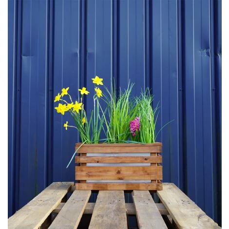 Le bac est constitué de lamelles de pin européen assemblé par des vis. Le bois est traité en autoclave classe 3 et teinté brun et l’acier galvanisé. Le bac à fleurs en bois acier dévoile un décor mix matière réussi très contemporain.