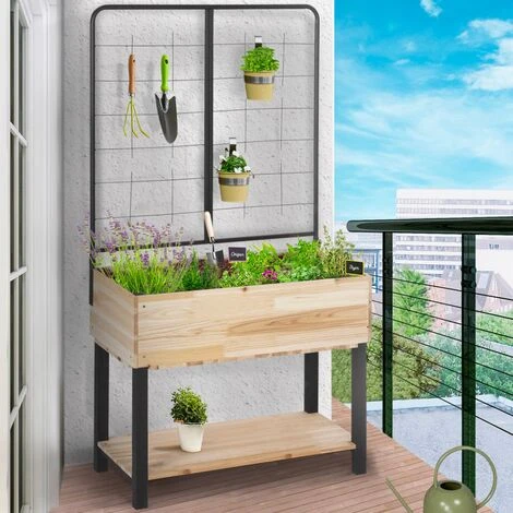 Cette jolie jardinière de 80 x 35 cm aux pieds peints en noir et au treillis en métal apporte un effet industriel très tendance à votre potager.Profitez de son large bac de plantation pour vous essayer au jardinage. Plantez un ensemble d’aromates, que vous serez fier de présenter dans vos salades d’été. Vous préférez une ambiance florale ? Optez pour un mélange de fleurs grimpantes et rampantes pour créer une composition unique. Les fleurs bénéficient du treillis pour se développer selon leur besoin et vous offrir le spectacle de leur éclosion. Le bac de la jardinière de 20 cm de hauteur et situé à 60 cm du sol, cela vous permet de cultiver sans avoir à vous agenouiller, mais aussi d’intéresser les plus jeunes aux bienfaits du jardinage. Que vous soyez team plantes, aromates ou légumes, la jardinière en bois sur pieds saura répondre à votre besoin. N’hésitez-plus et foncez dès maintenant pour un printemps fleuri et des plats d’été goûtus.Dimensions de la jardinière sur pied CHARLYDimensions hors tout : Longueur 80 cm x largeur 35 cm x Hauteur 138 cmDimensions du bac de plantation : L.80 x l.35 x H.20 cmDimensions sans treillis : L.80 x l.35 x H.60 cmDimensions du treillis : L.80 x H.78 cmStructure en bois de pin épaisseur 1,2 cm et treillis en acier D. 13 mmEpaisseur des pieds : 4 x 3 cmÀ monter soi-mêmeRetrouvez l’ensemble de nos carrés potager sur notre boutique en ligne !