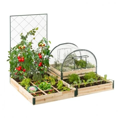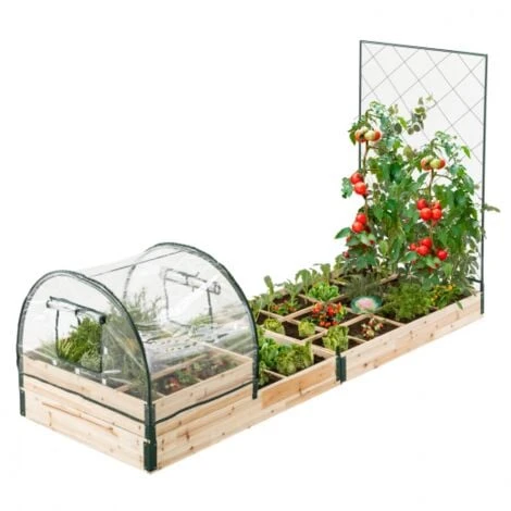 Vous aussi vous souhaitez cultiver vos propres fruits et légumes, mais vous ne voulez pas vous retrouver avec le même potager que votre voisin ? Le kit complet de carrés potagers modulables est fait pour vous !Faites parler votre imaginaire et construisez le jardin de vos envies. Notre kit complet est composé de 2 grands carrés XXL de 12 compartiments ainsi que d’un carré XL de 9 compartiments. Vous pouvez choisir d’accoler vos potagers pour créer une structure plus vaste, ou bien de disposer vos carrés au 4 coins de votre jardin ! Laissez libre court à vos envies de fruits, fleurs et légumes. Le potager XL est empilable sur la structure XXL pour disposer d’un potager plus profond.Le treillis de 80 x 115 CM s’adapte sur vos 3 potagers, vous pouvez ainsi faire pousser des plantes grimpantes ou bien des tomates ou haricots dans le potager de votre choix ! Quant à la housse dotée de 2 ouvertures, elle s’adapte sur le potager XL. Privilégiez donc vos plantations les plus fragiles à l’intérieur de ce potager. La bâche en PVC se pose sur une structure tubulaire de 16mm d’épaisseur. Les 2 fenêtres vous permettent d’aérer et de protéger vos plantations. Chacun des potager est conçu en bois de 14 mm d’épaisseur et est muni de quatre renforts en métal pour une meilleure tenue. Les deux potagers XXL de 120 x 80 x 13,5 CM sont munis de séparateurs en bois pour créer 12 compartiments par potager. Le potager XL de 60 x 80 x 13,5 CM peut quant à lui être divisé en 9 compartiments. Conseil IDMarket : appliquez un traitement sur le bois afin de prolonger sa durée de vie.Dimensions du kit complet carrés potagers modulables- Dimensions des carrés potagers XXL : L. 120 x l. 80 x H. 13,5 CM- Dimensions du carré potager XL : L. 60 x l. 80 x H. 13,5 CM- Dimensions du carré potager XL avec housse : H.54 CM- Bâche PVC 0,1 MM d’épaisseur – Structure tubes de 16 MM- 2 ouvertures de la bâche : L. 23 x H.24 CM- Treillis en métal : l.80 x H. 115 CM- Carrés potagers : bois naturel et métal noirRetrouvez l’ensemble de nos équipements du potager sur notre boutique en ligne !