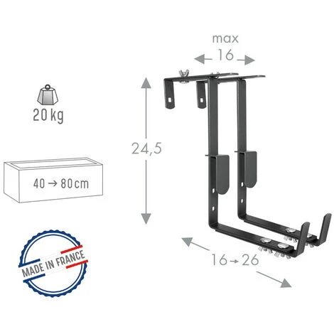 Ce lot de 2 supports de jardinières anthracite tout réglable est conçu pour accueillir vos jardinières allant de 40 à 80 cm et supportant un poids maximal de 20 kg. Des pattes de sécurité sont intégrées au lot. Les fixations réglables et extensibles jusqu’à 16 cm vous permettent de fixer ces 2 supports sur le rebord de votre choix. La profondeur est également réglable de 16 à 26 cm. Idéal pour vos balcons ou palissades, il mettra en valeur vos jardinières. Fabrication française. Acier époxy résistant au gel et UV.