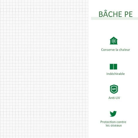 – Bâche transparente en polyéthylène imperméable anti-UV haute densité 140 g/m² rallongée d’une dizaine de cm pour un meilleur maintien au sol